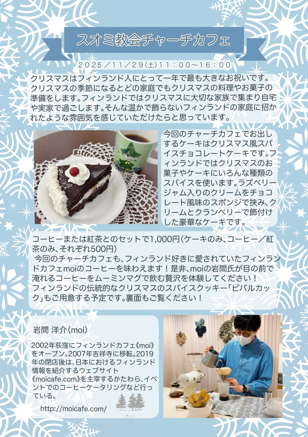 スオミ教会の礼拝は10時30分に始まりますが、10時25分に牧師が挨拶とその日の礼拝の注意事項や連絡事項をお知らせします。遅れて到着される方は、教会の者が案内しますので静かに礼拝堂にお入り下さい。 これまで来訪者全員にお願いしていたマスク着用は個人の判断に委ねることにしました。ただし、発熱や咳などの症状がある時は来訪をお控え下さるようお願い申し上げます。