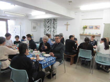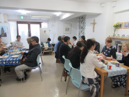 祝会の様子です、今年も美味しい食べ物と堀越姉のハンドベル指導でにぎやかに祝会を楽しみました。