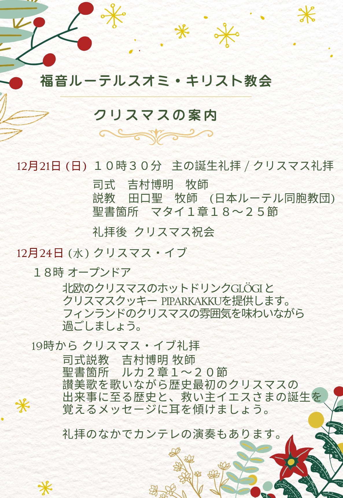 集会の内容等、お問い合わせは、TEL(03-6233-7109)または電子メール gro.i1765765868akuoy1765765868kimou1765765868s@ihs1765765868ukob1765765868 のいずれかで当教会(吉村牧師)までお気軽にどうぞ。下記は、スオミ・キリスト教会の全集会全部のスケジュールです。