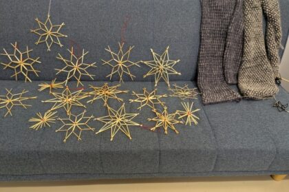 藁はフィンランドでは昔からクリスマス・オーナメントの材料として使われ、現在も人気がある素材です。藁で作る「ヒンメリ」、「星」、「天使」などの伝統的なクリスマス飾りを藁で作る人は今も多いです。藁は農業から生まれる素朴な素材ですが、このような可愛らしいオーナメントにも用いられます。現在は穀物は機械的に脱穀されているために長い藁を見つけるのは難しいです。もしどこかで見つけることができればラッキーです。
