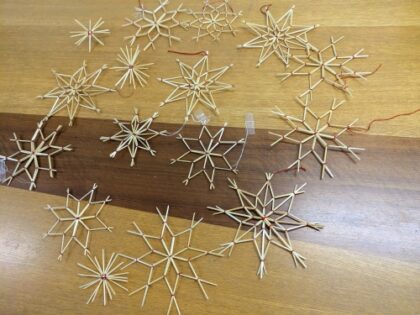 クリスマス・オーナメントに使われる藁は主にライ麦と小麦のもが多いです。どちらも丈夫で光が当たると、白い控えめな輝きを放ちます。お部屋の天井に吊るされた藁の「ヒンメリ」や窓に掛けた「星」はクリスマスの心が温める雰囲気を高めてくれます。