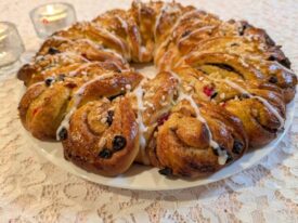 今日皆さんと一緒に作ったリースの生地は料理クラブで何度も作ったコーヒー・ブレッドの生地と殆ど同じですが、リースの形に作るのは初めてです。クリスマス・リースの特徴はクリスマス・スパイス、ドライフルーツやアーモンドダイスを使うことです。リーズの形自体も本当のクリスマスシースの印象を与えるのでクリスマスのお祝いの気分を高めてくれます。