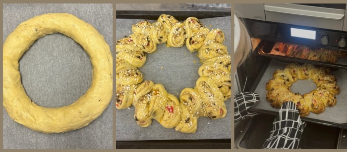 それから生地をロール状にして、それを鉄板に丸い形のリースにしてからハサミで切ります。ロールを新しい形にすると中身のドライフルーツがきれいに見えてきます。「面白い!」「こんなの初めて」との声がします。それから二回目の発酵です。