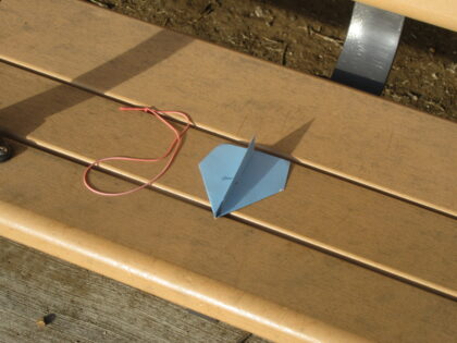 朝のスポーツ公園を散策していると二人の男の人が空に向けて何やら飛ばしています。その一つが目の前に落ちて来たので拾ってみるとそれは紙飛行機でした。割り箸を胴体にして紙の翼を付けゴムのカタパルトで飛ばす素朴な飛行機です。面白そうなので暫く見ていたら、その一人がやって来て色々詳しく説明してくれ更に小さな紙飛行機とゴム紐をくれました。教えられた通りに右手に飛行機を持ち左手でゴムを引っ張り引き離すと飛行機は勢いよく空に向かって飛んで行きました。頂点に達すると風に乗ってゆっくりと輪を描きながら下りてきます。この広場は飛行機遊びの格好の場所でした。子供の頃、竹ひごと紙で作ったグライダーやゴム動力の飛行機を思い出しながら懐かしく遊んでいました。暫くは朝の散歩にはこの紙飛行機とゴム紐を胸のポケットに忍ばせて行く事になりそうです。