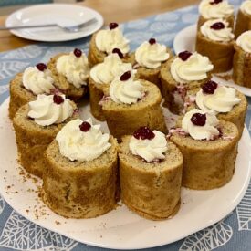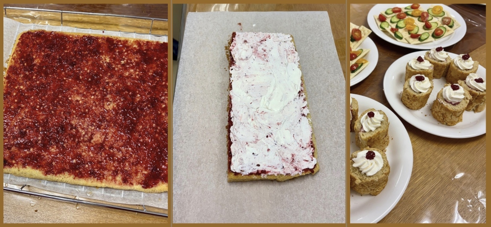 ケーキを冷ましている間に今度は中身を作ります。材料を計ってクリームを泡立てます。それから本格的にケーキ作りに入ります。冷めたケーキの上にシロップを塗ってラズベリージャムを全体に拡げます。その上にさらに泡立てたクリームを拡げます。そして、いよいよケーキをロールにします。ケーキが割れないように注意しながら少しずつロールします。ロールしたケーキをしばらく冷蔵庫で冷やしてから切ります。一個一個お皿の上にのせてクリームで飾り付けをして、その上にラズベリージャムをのせると、「可愛い!」「きれい!」の声があがりました。これで「ルーネベリロール」の出来上がりです!