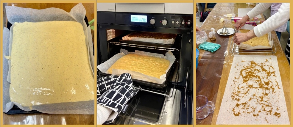 料理クラブはいつもお祈りをしてスタートします。初めにアーモンドパウダー、片栗粉などの粉類を計ります。今回の生地は小麦粉を入れることがなく小麦粉アレルギーの方にも味わっていただけるお菓子なのです。次に卵と砂糖をハンドミキサーで泡立てて、白い泡になってから粉類を中に加えると生地が出来ます。それを鉄板に広げてオーブンに入れて焼き始めます。あっという間に生地の焼き香りが広がって、ケーキに焼き上がりました。クッキングシートに潰したクッキーをかけてその上にケーキをひっくり返して冷まします。